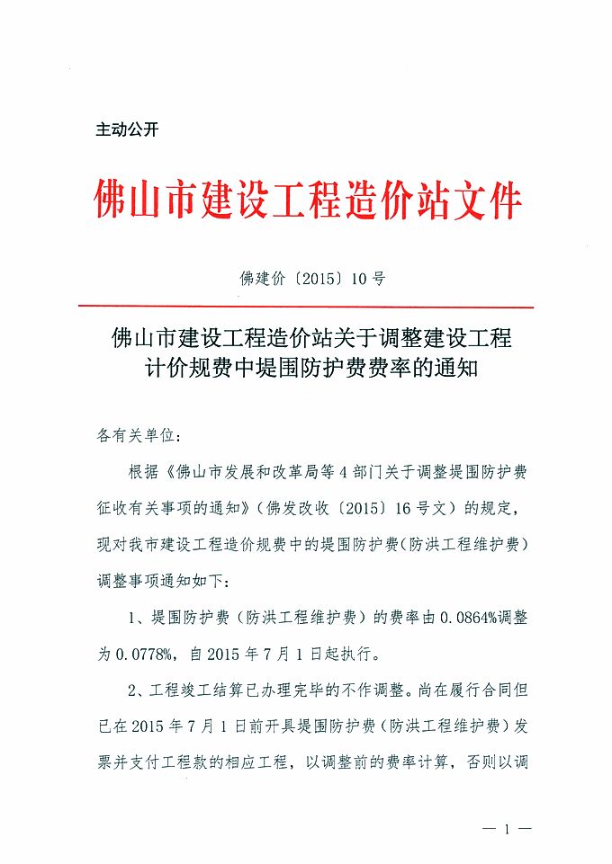 佛山市建設(shè)工程造價(jià)站關(guān)于調(diào)整建設(shè)工程計(jì)價(jià)規(guī)費(fèi)中堤圍防護(hù)費(fèi)費(fèi)率的通知