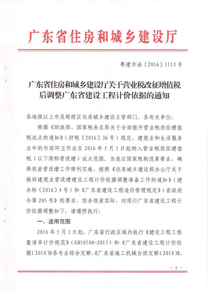 廣東省住房和城鄉(xiāng)建設(shè)廳關(guān)于營業(yè)稅改征增值稅后調(diào)整廣東省建設(shè)工程計價依據(jù)的通知