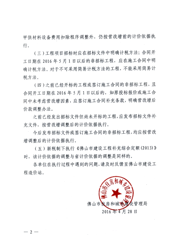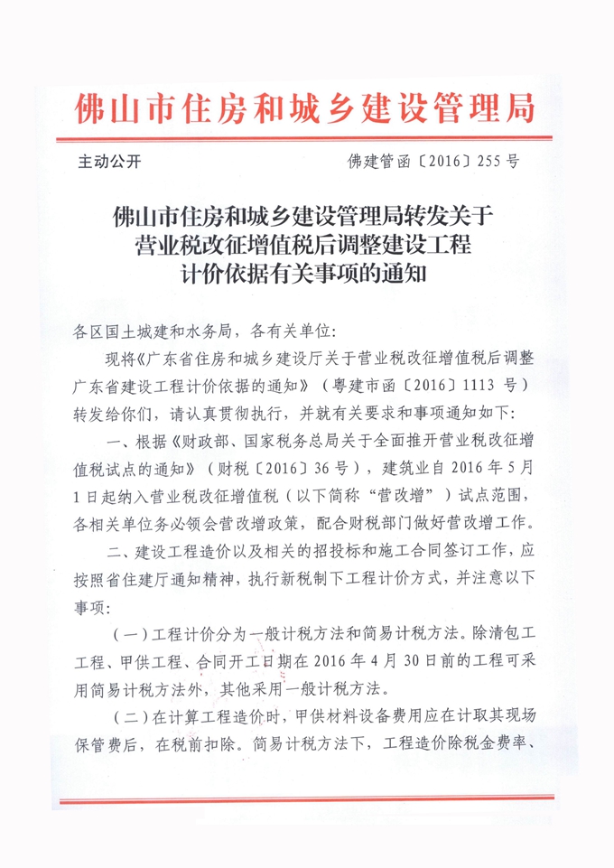 佛山市住房和城鄉(xiāng)建設(shè)管理局轉(zhuǎn)發(fā)關(guān)于營業(yè)稅改征增值稅后調(diào)整建設(shè)工程計價依據(jù)有關(guān)事項的通知