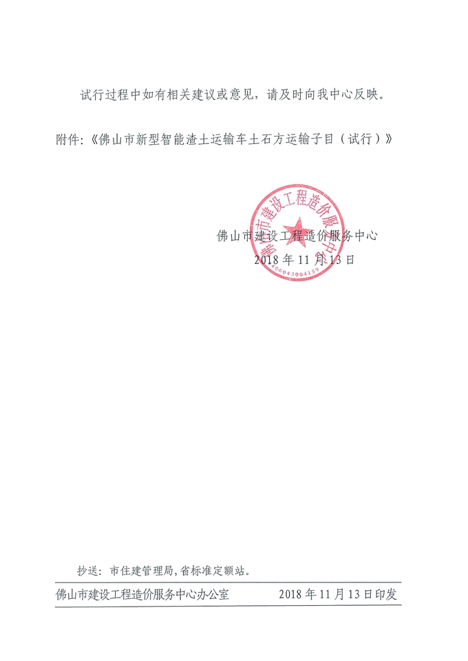 佛山市建設(shè)工程造價(jià)服務(wù)中心關(guān)于發(fā)布《佛山市新型智能渣土運(yùn)輸車土石方運(yùn)輸子目(試行)》的通知