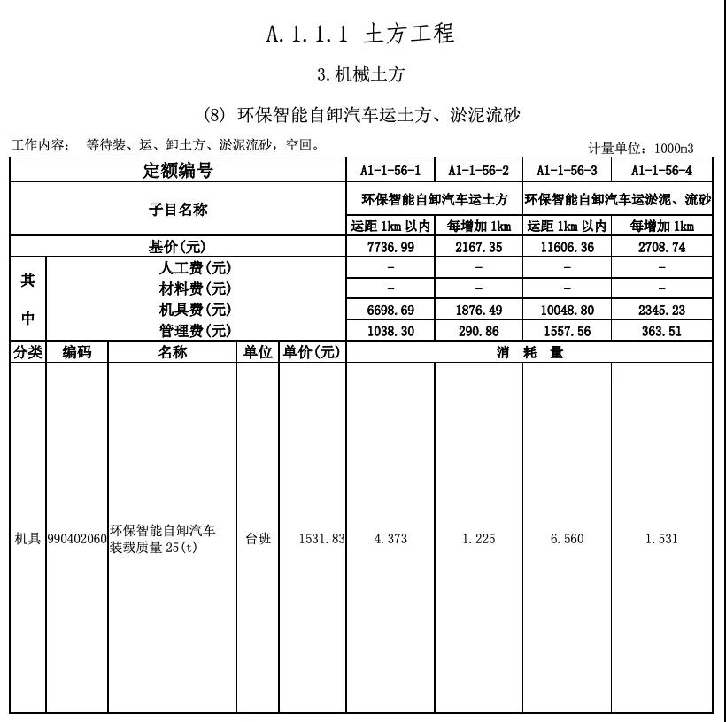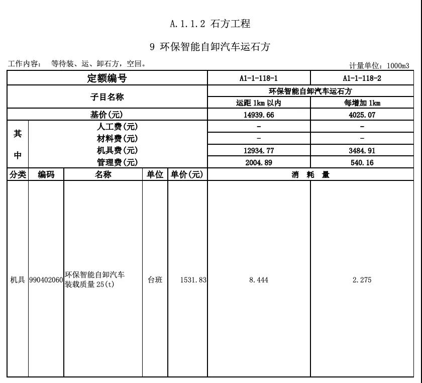 2.本補充定額子目已包括了環保智能自卸汽車等待裝、運、卸土方、淤泥流砂、石方以及空車回程等的臺班消耗量,不包括棄土場消納處置費。