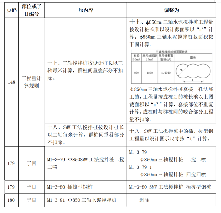 近期,我站組織專家研究分析了廣東省建設(shè)工程定額動(dòng)態(tài)管理系統(tǒng)收集的《廣東省城市軌道交通工程綜合定額2018》三軸水泥攪拌樁及SMW工法攪拌樁與市場(chǎng)實(shí)際存在一定差異的反饋意見(jiàn)。為加強(qiáng)定額動(dòng)態(tài)管理,經(jīng)廣泛調(diào)研與測(cè)算,現(xiàn)將三軸水泥攪拌樁及SMW工法攪拌樁項(xiàng)目調(diào)整后的內(nèi)容印發(fā)。本調(diào)整內(nèi)容與省現(xiàn)行工程計(jì)價(jià)依據(jù)配套使用,請(qǐng)遵照?qǐng)?zhí)行。執(zhí)行中遇到的問(wèn)題,請(qǐng)通過(guò)“廣東省工程造價(jià)信息化平臺(tái)——建設(shè)工程定額動(dòng)態(tài)管理系統(tǒng)”及時(shí)反映。