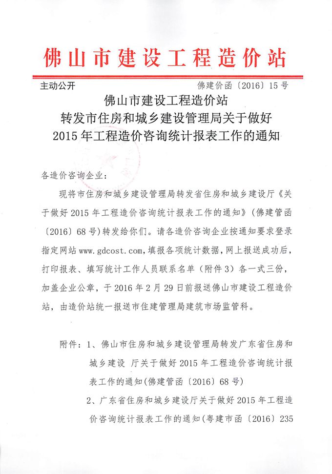 佛山市建設工程造價站轉發省住房和城鄉建設廳關于做好2015年工程造價咨詢統計報表工作的通知