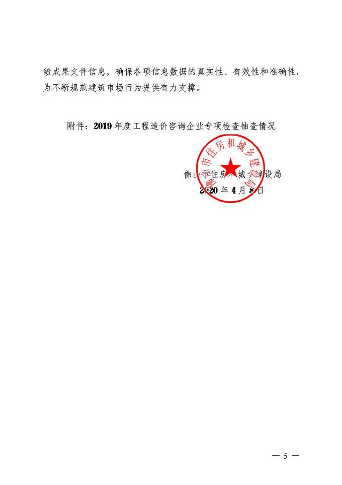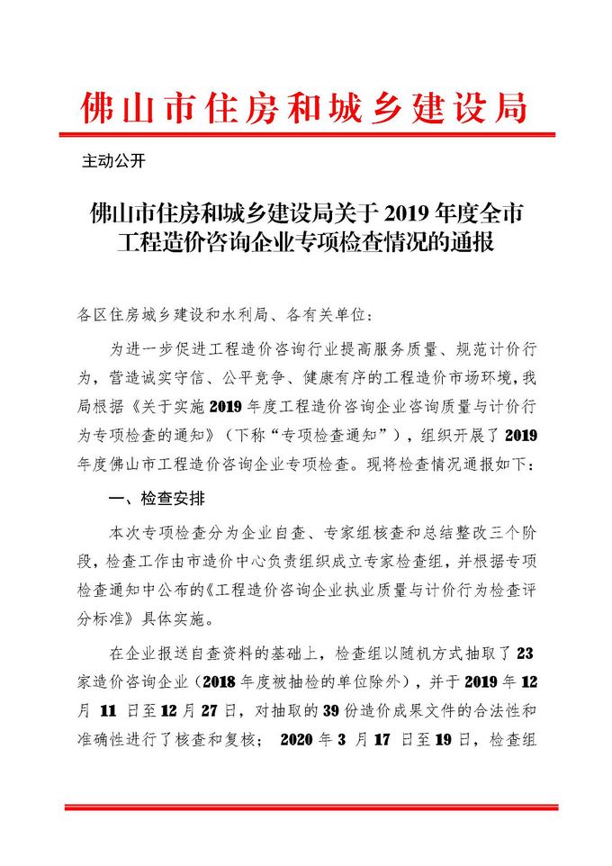 佛山市住房和城鄉建設局關于2019年度全市工程造價咨詢企業專項檢查情況的通報