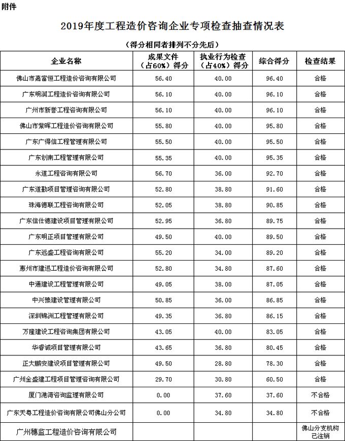 附件:佛山市2019年度工程造價咨詢企業專項檢查抽查情況表