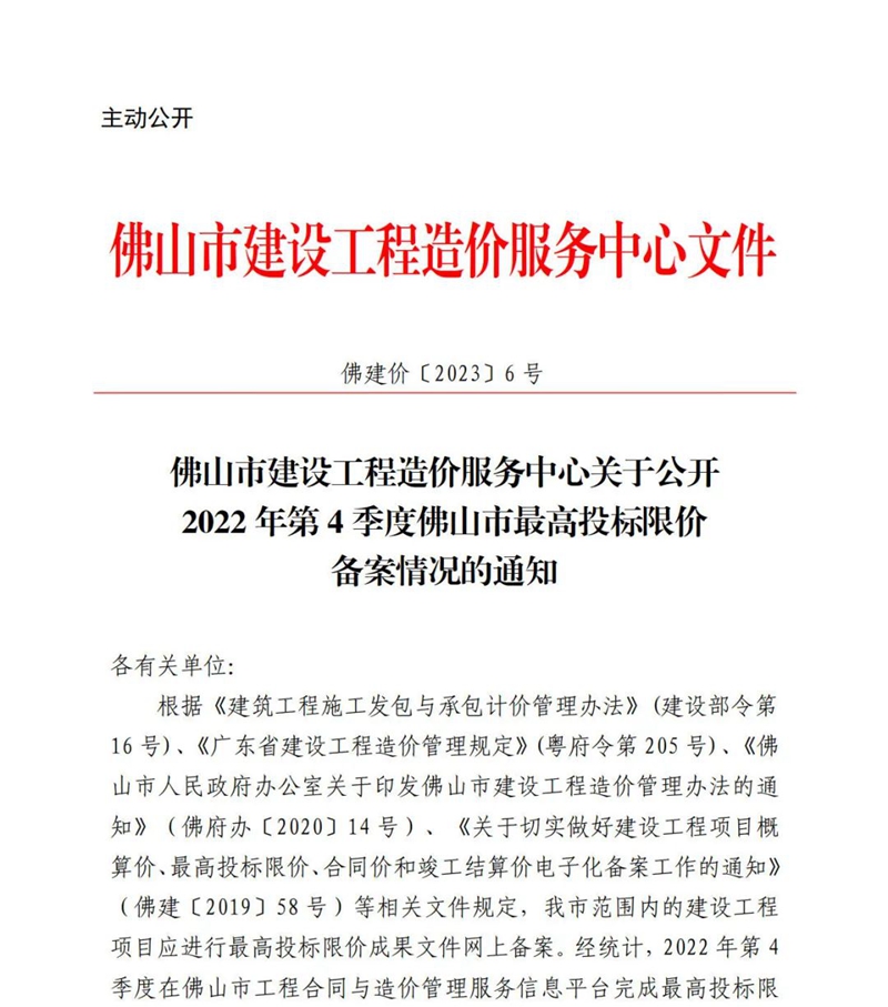 佛山市建設(shè)工程造價(jià)服務(wù)中心關(guān)于公開2022年第4季度佛山市最高投標(biāo)限價(jià)備案情況的通知