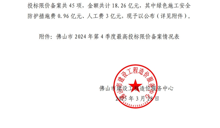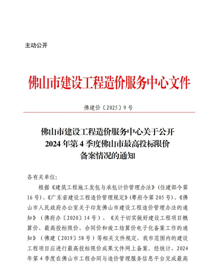 轉發 | 佛山市建設工程造價服務中心關于公開2024年第4季度佛山市最高投標限價備案情況的通知