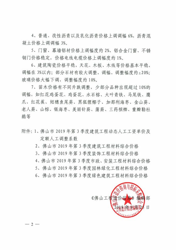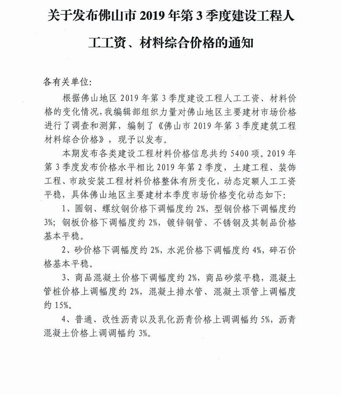 關(guān)于發(fā)布佛山市2019年第3季度建設(shè)工程人工工資、材料綜合價(jià)格的通知