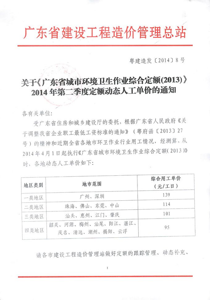 關(guān)于《廣東省城市環(huán)境衛(wèi)生作業(yè)綜合定額(2013)》2014年第二季度定額動態(tài)人工單價的通知