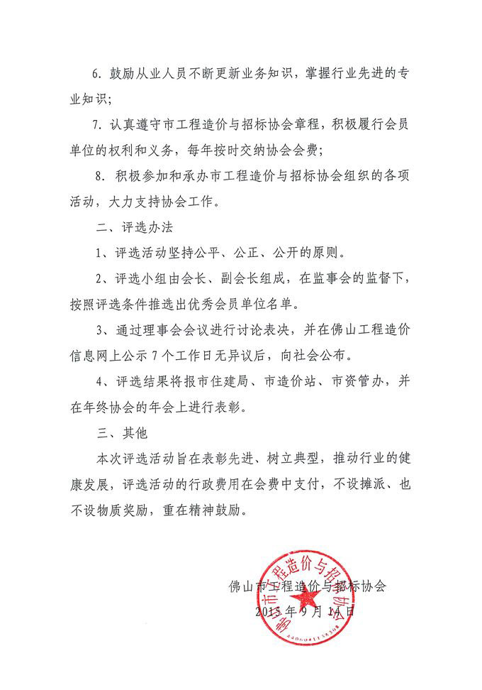 佛山市工程造價與招標協(xié)會關(guān)于評選2015年度優(yōu)秀會員單位的通知