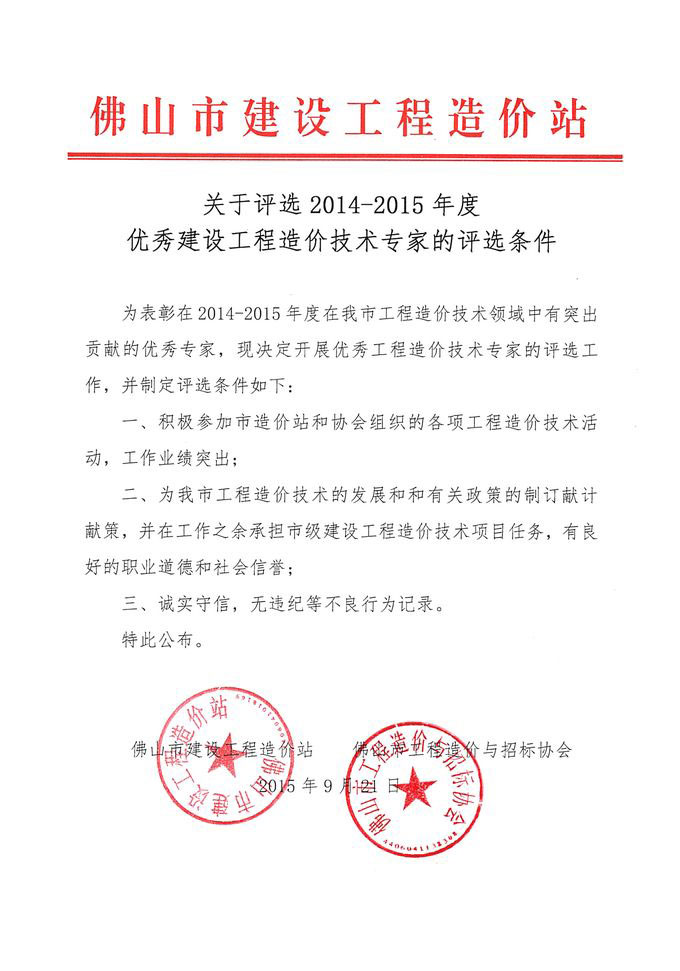 關于評選2014-2015年度優秀建設工程造價技術專家的評優條件