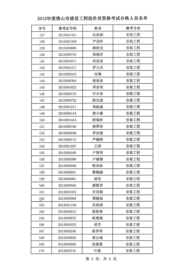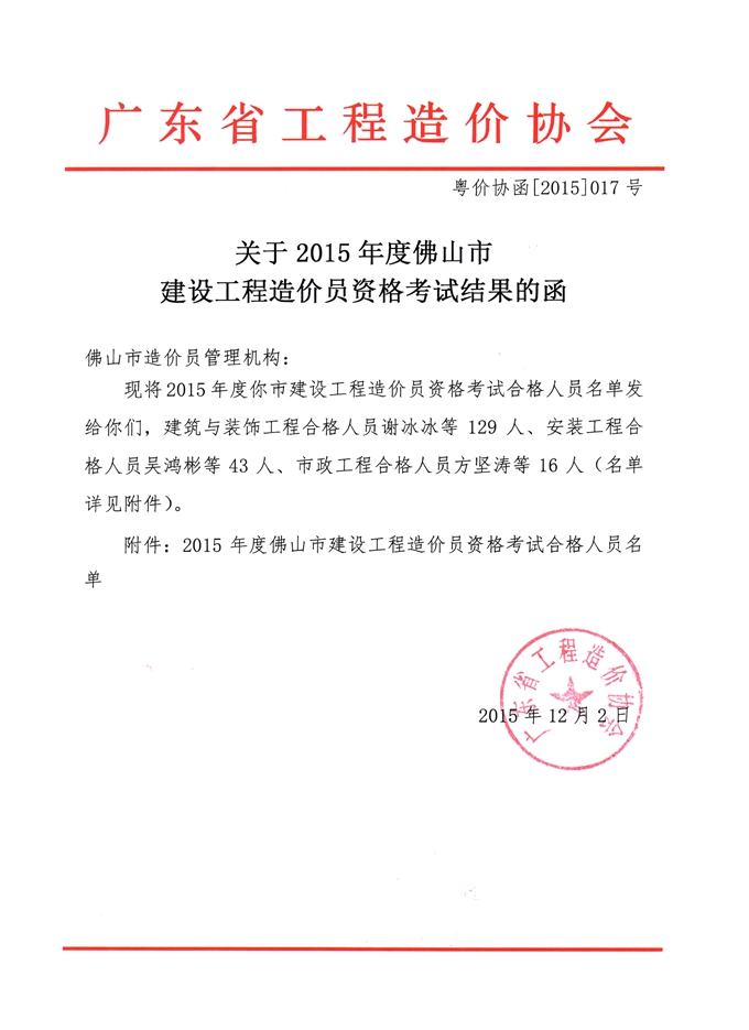 關于2015年度佛山市建設工程造價員資格考試結果的函