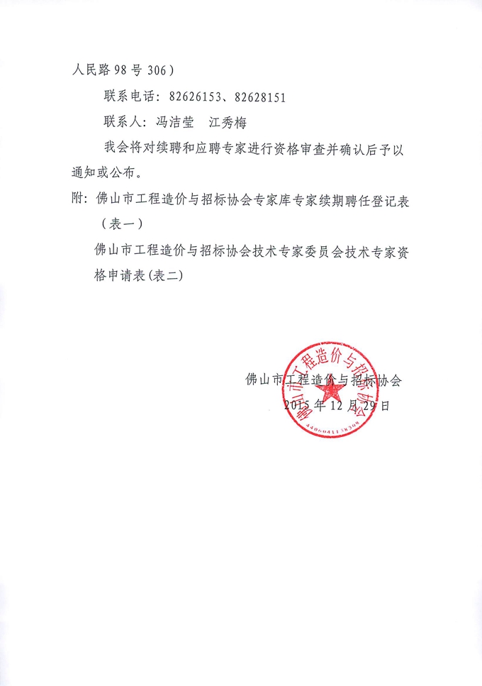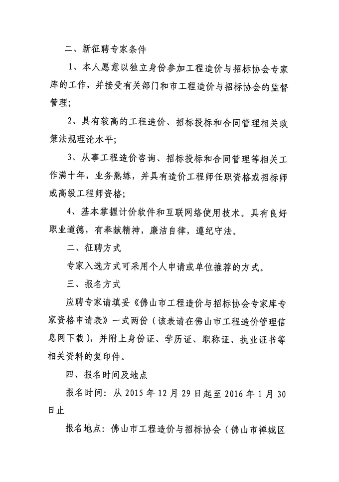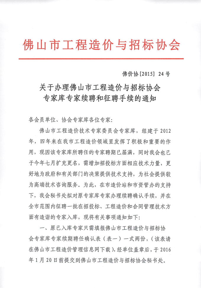 關于辦理佛山市工程造價與招標協會專家庫專家續聘和征聘手續的通知