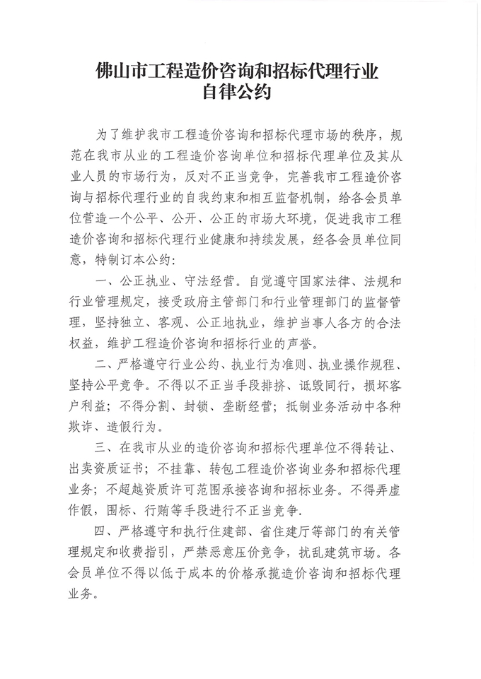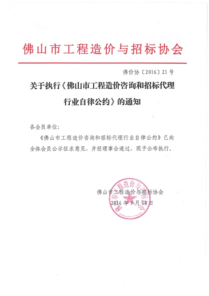 關于執(zhí)行《佛山市工程造價咨詢和招標代理行業(yè)自律公約》的通知