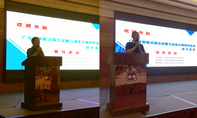 (廣東省建設(shè)工程造價(jià)管理總站黃中廣科長(zhǎng)(左)、佛山市建設(shè)工程造價(jià)站余建平站長(zhǎng)(右)發(fā)表重要講話(huà))