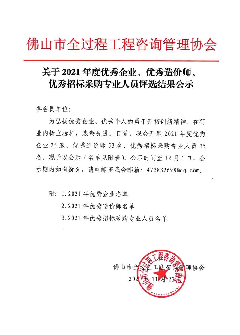 關(guān)于2021年度優(yōu)秀企業(yè)、優(yōu)秀造價(jià)師、優(yōu)秀招標(biāo)采購專業(yè)人員評選結(jié)果公示