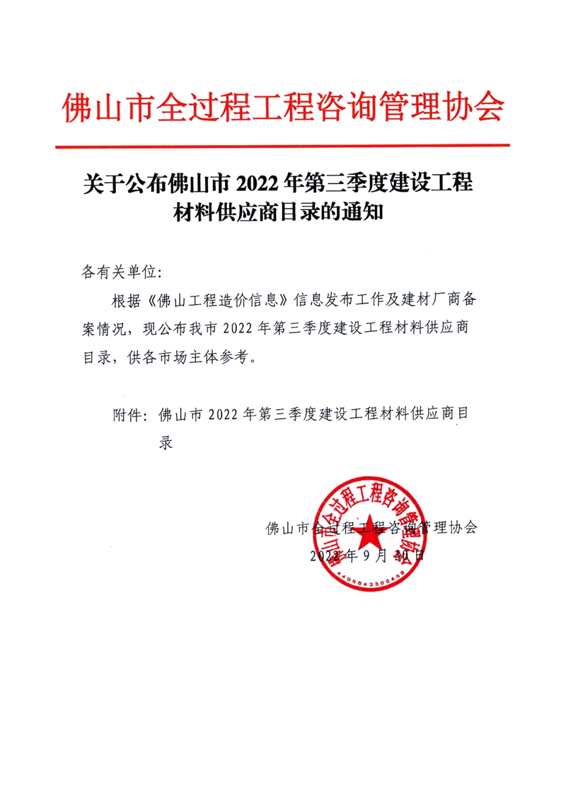 關于公布佛山市2022年第三季度建設工程材料供應商目錄的通知