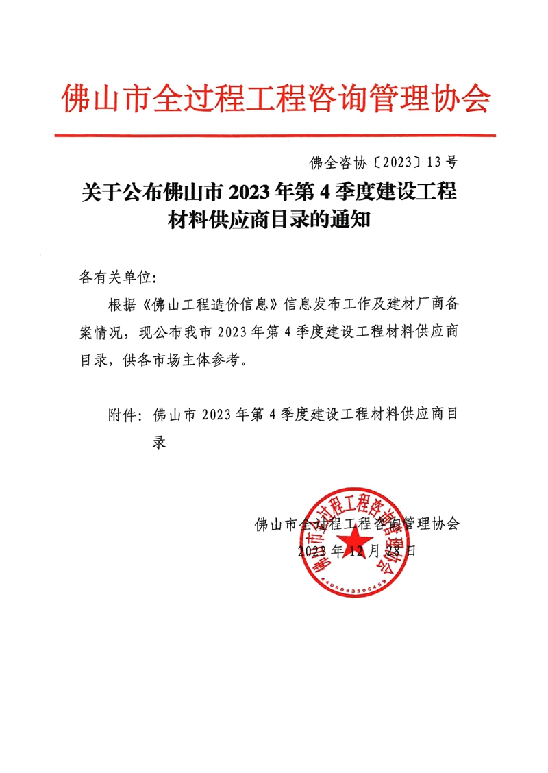 關于公布佛山市2023年第4季度建設工程材料供應商目錄的通知