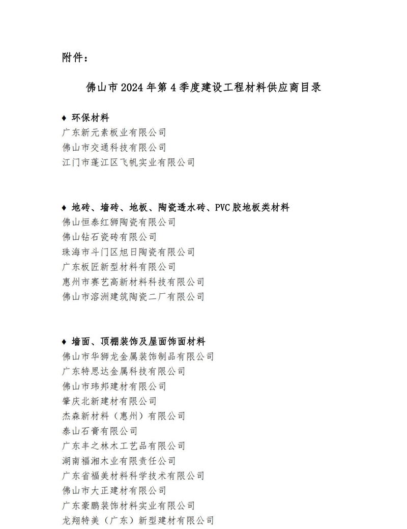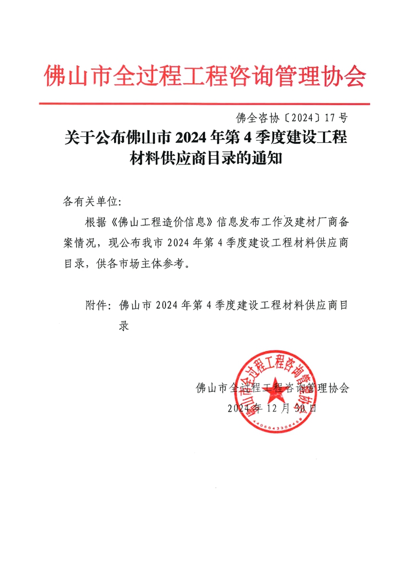 關于公布佛山市2024年第4季度建設工程材料供應商目錄的通知