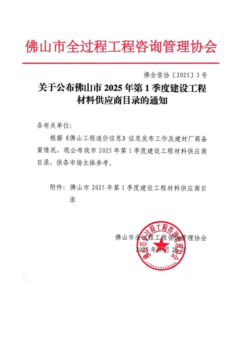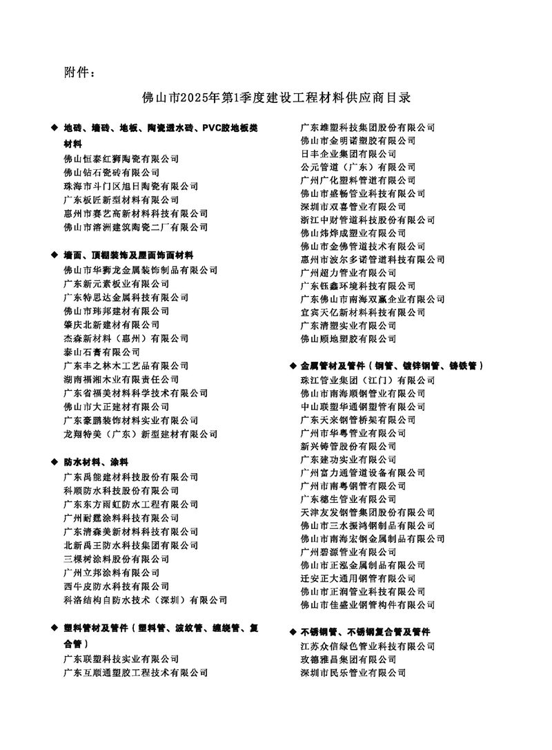 關于公布佛山市2025年第1季度建設工程材料供應商目錄的通知