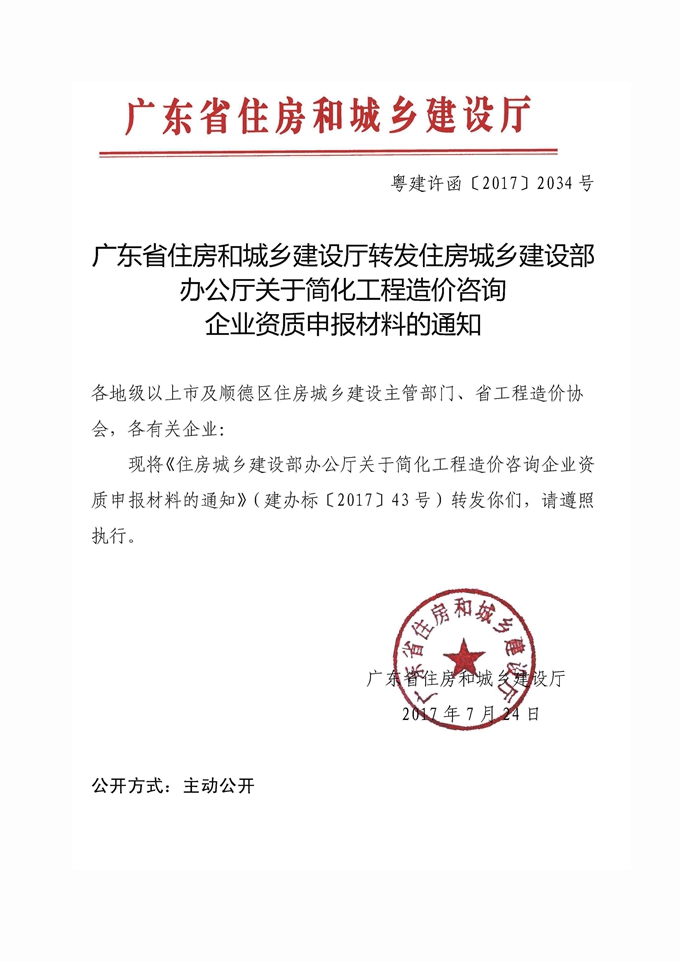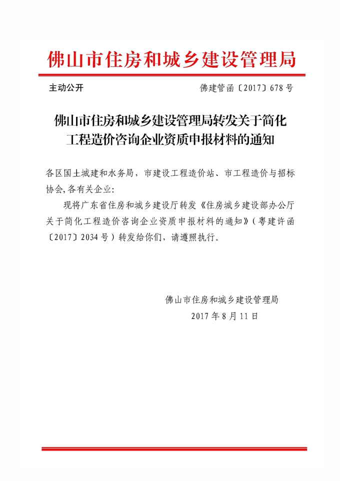 佛山市住房和城鄉建設管理局轉發關于簡化工程造價咨詢企業資質申報材料的通知
