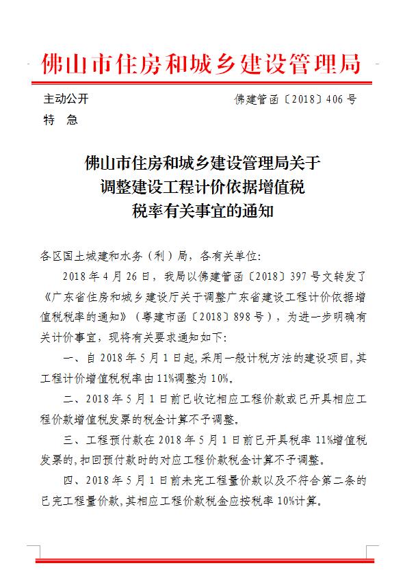 佛山市住房和城鄉建設管理局關于調整建設工程計價依據增值稅稅率有關事宜的通知