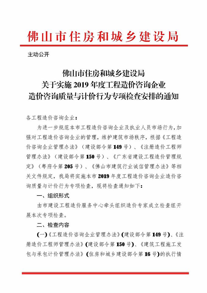 佛山市住房和城鄉(xiāng)建設(shè)局關(guān)于實(shí)施2019年度工程造價(jià)咨詢企業(yè)造價(jià)咨詢質(zhì)量與計(jì)價(jià)行為專項(xiàng)檢查安排的通知