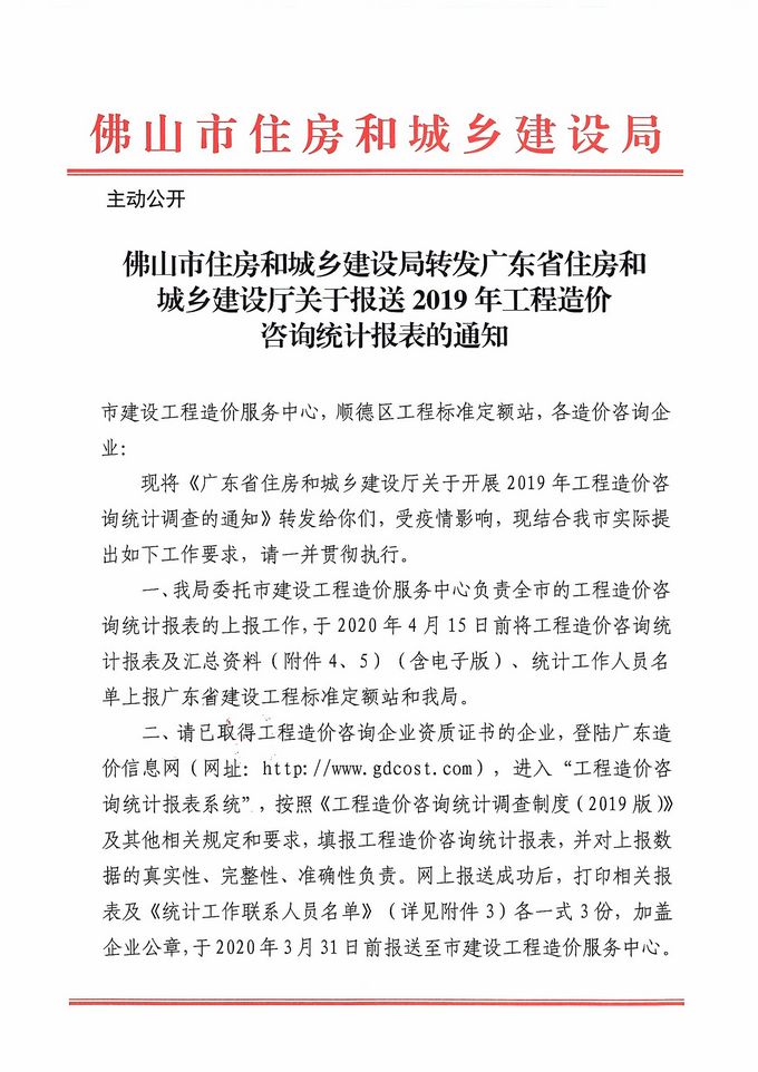 佛山市住房和城鄉建設局轉發廣東省住房和城鄉建設廳關于報送2019年工程造價咨詢統計報表的通知