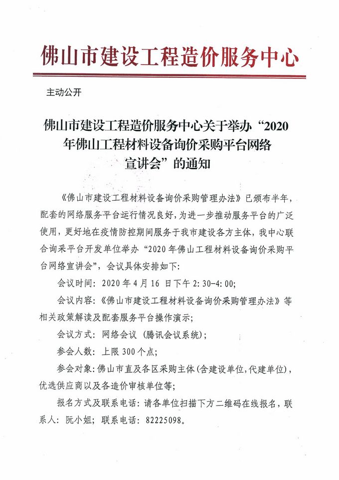 佛山市建設工程造價服務中心關于舉辦“2020年佛山工程材料設備詢價采購平臺網絡宣講會”的通知