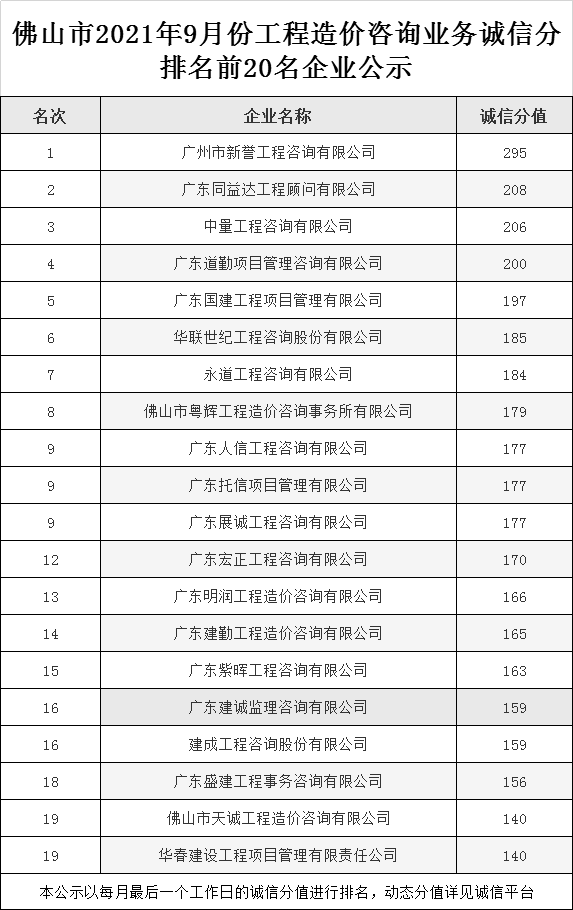佛山市2021年9月份工程造價咨詢業務誠信分排名前20名企業公示