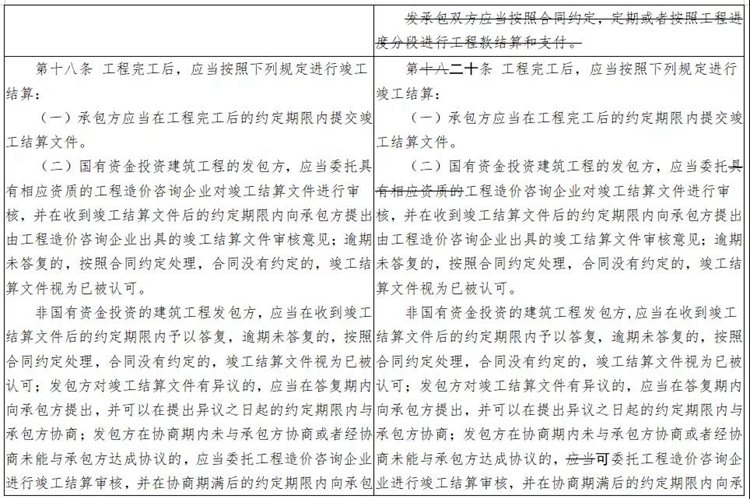 一是增加關于工期的條款。二是刪除原辦法中有關工程造價鑒定內容。三是規范文字表述。將“住房城鄉建設主管部門”統一修改為“住房和城鄉建設主管部門”;將“縣級以上地方人民政府”統一修改為“縣級以上人民政府”;將“工程計價有關規定和市場價格信息”統一修改為“工程計價依據”。