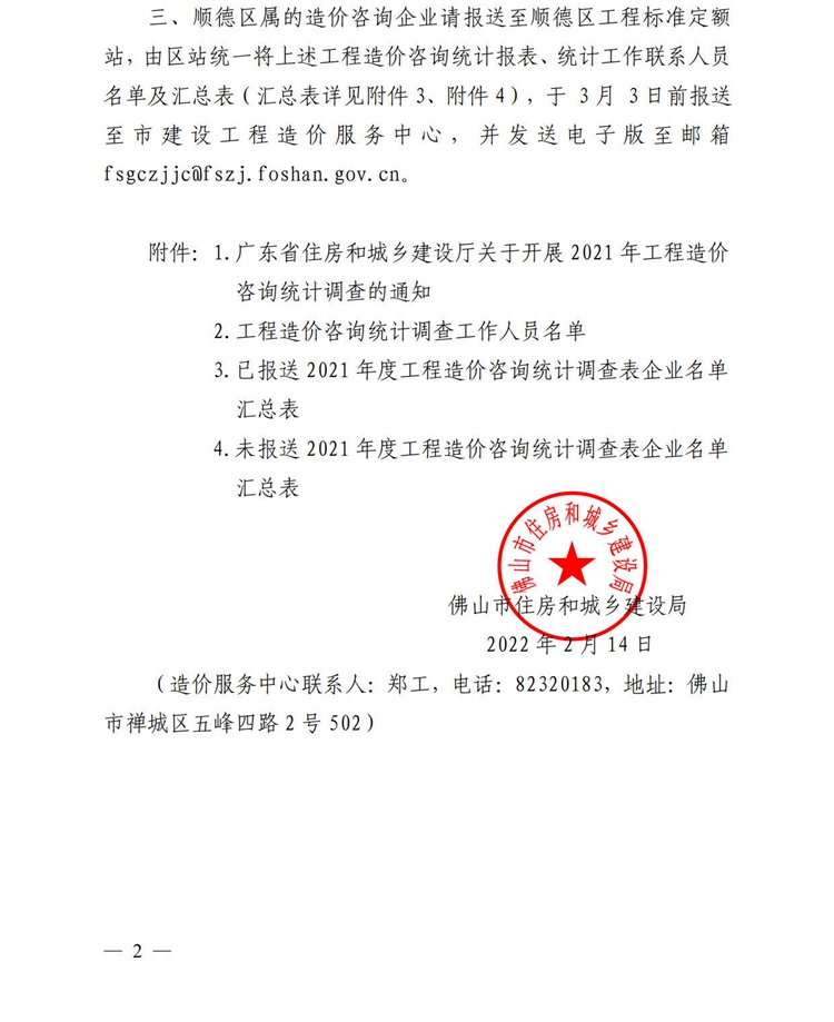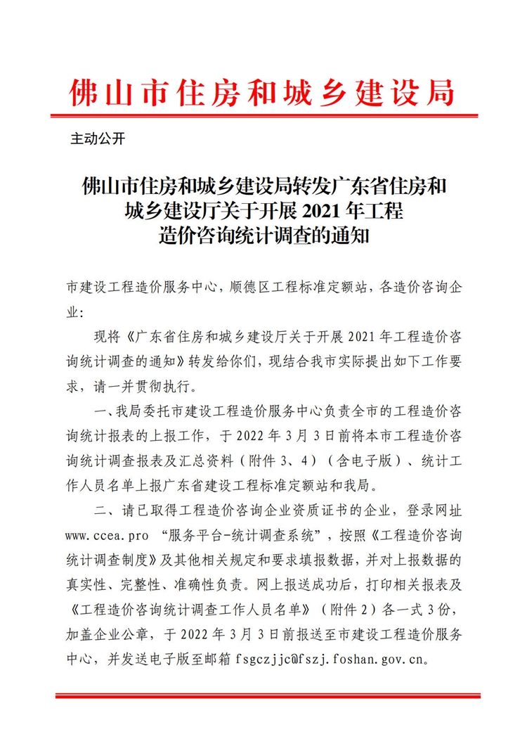 佛山市住房和城鄉建設局轉發廣東省住房和城鄉建設廳關于開展2021年工程造價咨詢統計調查的通知