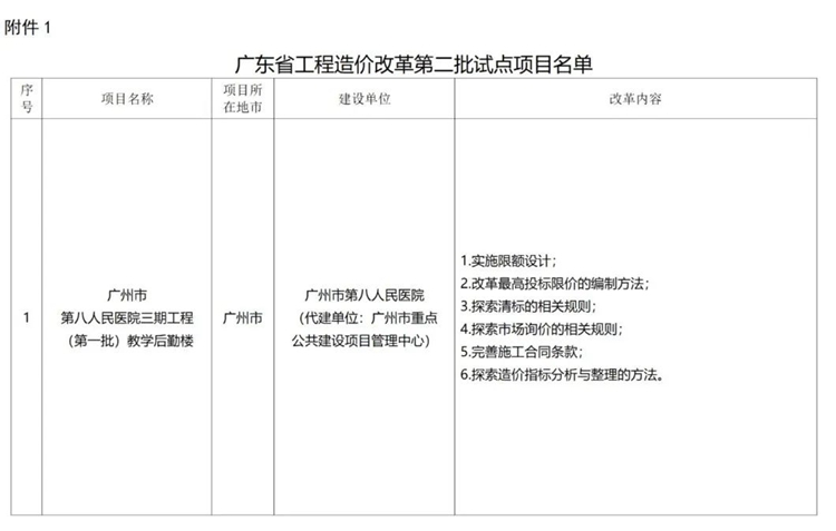 按照《廣東省住房和城鄉(xiāng)建設廳關于印發(fā)廣東省工程造價改革試點工作實施方案的通知》(粵建市函〔2021〕502號)的工作部署,經(jīng)工程項目建設單位自主申報、市住房城鄉(xiāng)建設主管部門推薦,我廳審核確定廣州市第八人民醫(yī)院三期工程等31個項目為廣東省工程造價改革第二批試點項目(詳見附件1),現(xiàn)予以公布。