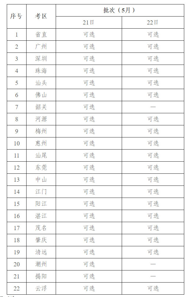 5月21、22日每日安排1個批次,共2個批次。各考區(qū)的批次安排不同,具體詳見附件2。