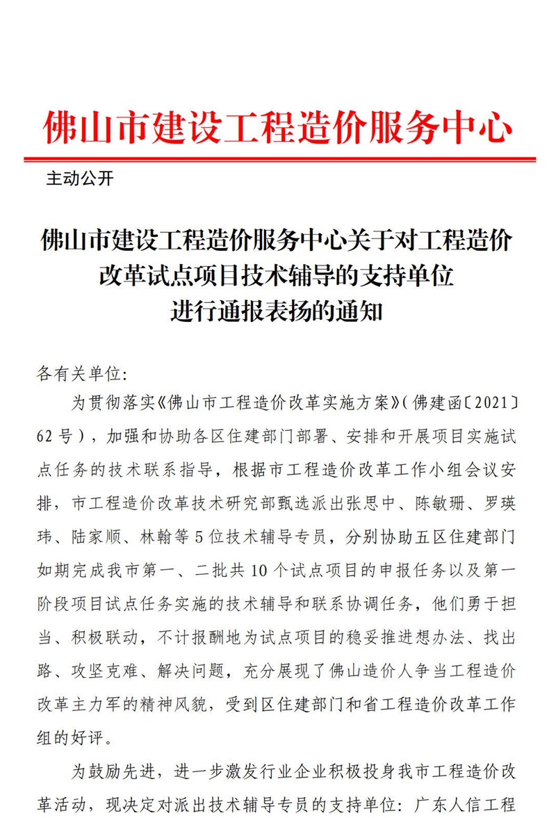 佛山市建設工程造價服務中心關于對工程造價改革試點項目技術輔導的支持單位進行通報表揚的通知