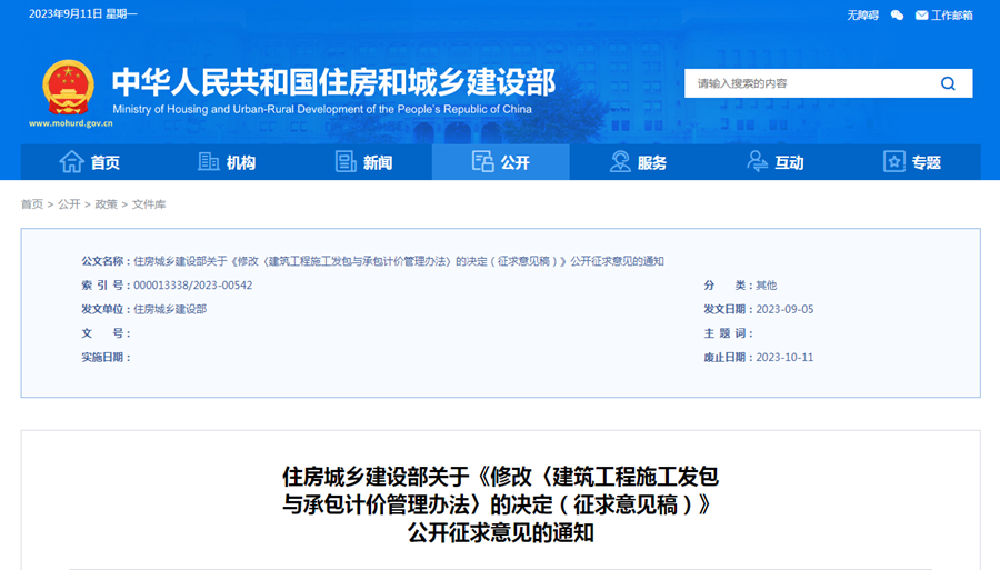 為落實工程造價改革要求,住房城鄉建設部擬修改《建筑工程施工發包與承包計價管理辦法》,起草了《住房城鄉建設部關于修改〈建筑工程施工發包與承包計價管理辦法〉的決定(征求意見稿)》,現向社會公開征求意見。公眾可通過以下途徑和方式提出反饋意見: