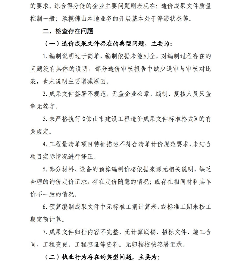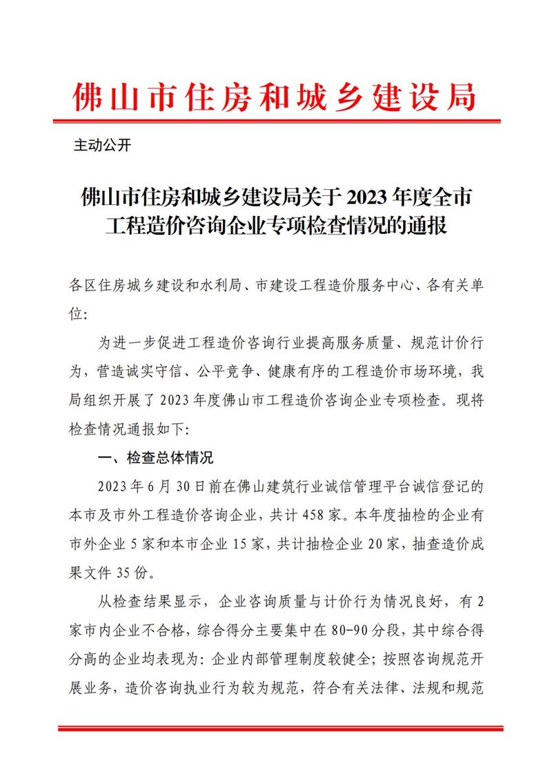 佛山市住房和城鄉建設局關于2023年度全市工程造價咨詢企業專項檢查情況的通報