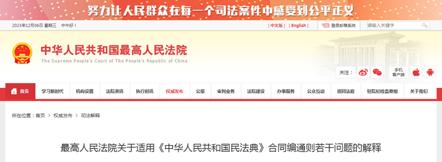 《最高人民法院關于適用〈中華人民共和國民法典〉合同編通則若干問題的解釋》已于2023年5月23日由最高人民法院審判委員會第1889次會議通過,現(xiàn)予公布,自2023年12月5日起施行。