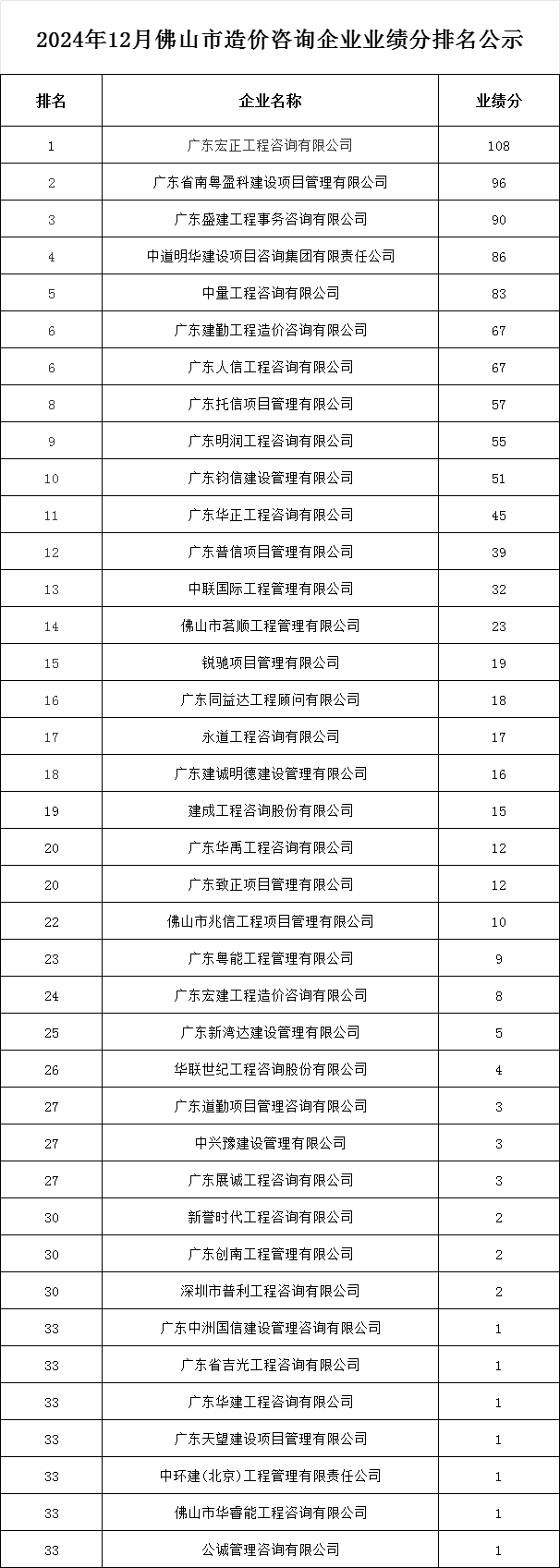 轉發 | 2024年12月佛山市造價咨詢企業業績分排名公示