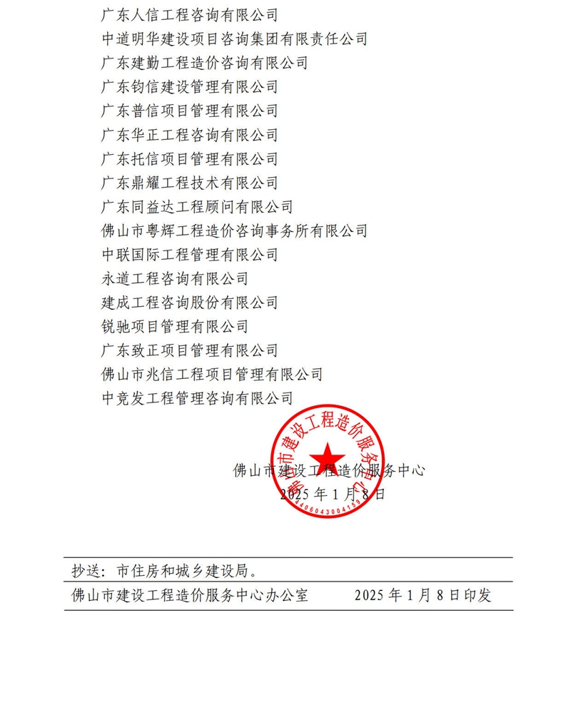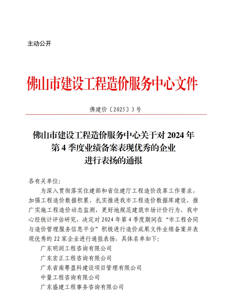 佛山市建設(shè)工程造價(jià)服務(wù)中心關(guān)于對(duì)2024年第4季度業(yè)績(jī)備案表現(xiàn)優(yōu)秀的企業(yè)進(jìn)行表揚(yáng)的通報(bào)