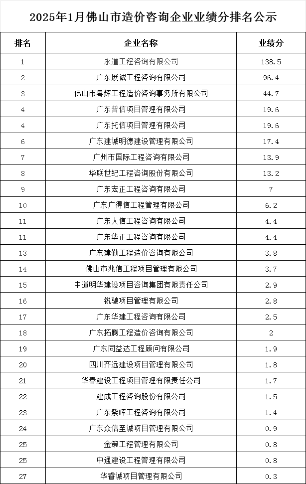 轉發 | 2025年1月佛山市造價咨詢企業業績分排名公示