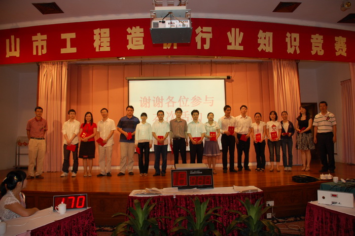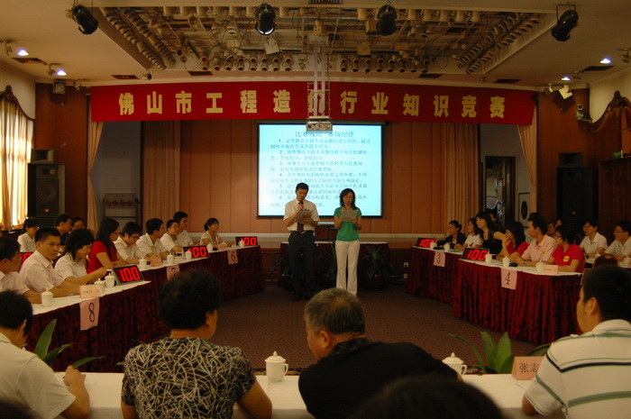 全市工程造價行業知識競賽2008年7月2日上午在佛山市禪城區佳寧娜大酒店中華廳舉行。全市五區和外地駐市造價咨詢企業派出的11支隊伍共33人參加競賽,各參賽區、企業也組織了啦啦隊助興。競賽過程場面氣氛活躍、緊張、熱烈、有序。經過激烈的角逐,禪城區二隊(佛山市紫暉公司隊)奪得第一名,南海區一隊(佛山智勤、南海宏正、南海創南公司隊綜合組隊)、順德區二隊(順德人信公司隊)奪得第二名,禪城區一隊(佛山市同益達公司隊)、高明區隊(高明建信公司隊)、外地駐市一隊(廣東中量公司隊)奪得第三名,順德區二隊、南海區二隊、三水區一、二隊、外地駐市二隊等五支參賽隊獲優勝獎,順德區、南海區獲得優秀組織獎。