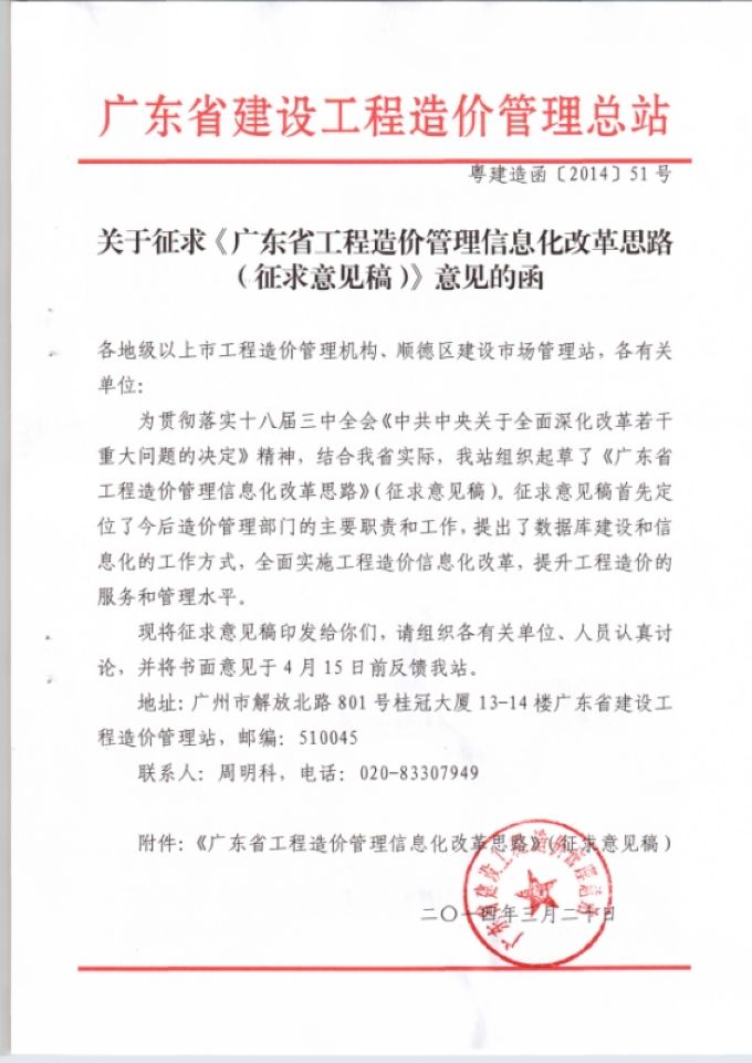 關于征求《廣東省工程造價管理信息化改革思路(征求意見稿)》意見的函